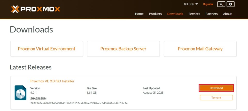 まず公式サイト(https://www.proxmox.com/en/downloads)へアクセスし、「Proxmox VE 9.0 ISO Installer」をダウンロードします。