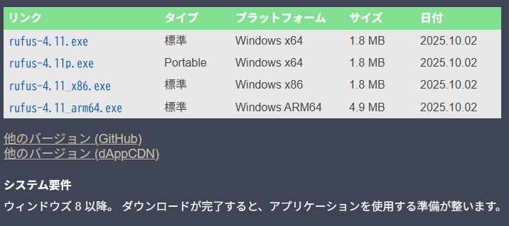 | Rufus(USB作成ツール) | https://rufus.ie/ja/ ※Windows版のみ |