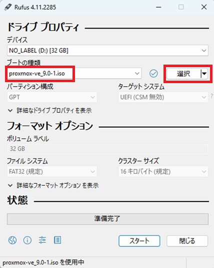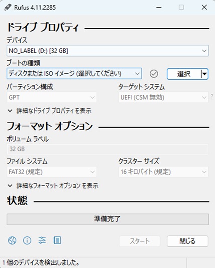 ①PCにUSBメモリを挿し、Rufusを起動します。以下のような操作画面が表示されます。
