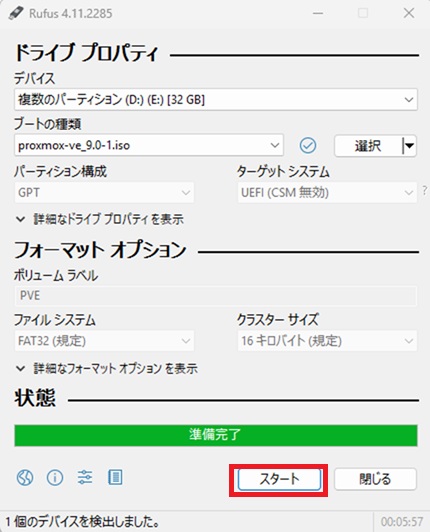 スタートをクリックし、USBメモリへ書き込みます。以下のように緑のゲージが溜まり、準備完了と表示されればインストールメディアの作成完了です。閉じるで操作画面を終了しましょう。
